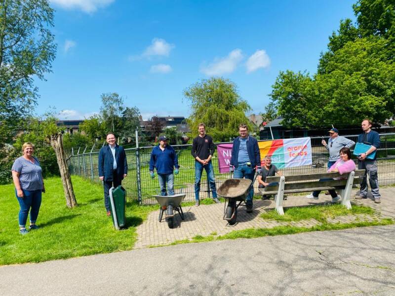 Een strakblauwe lucht en een stralend zonnetje verwelkomden op 15 maart een vijftiental vrijwilligers in het Jeugdhonk in het Henk van der Griftpark. Heel fijn dat de naamgever van het park ook aanwezig was!